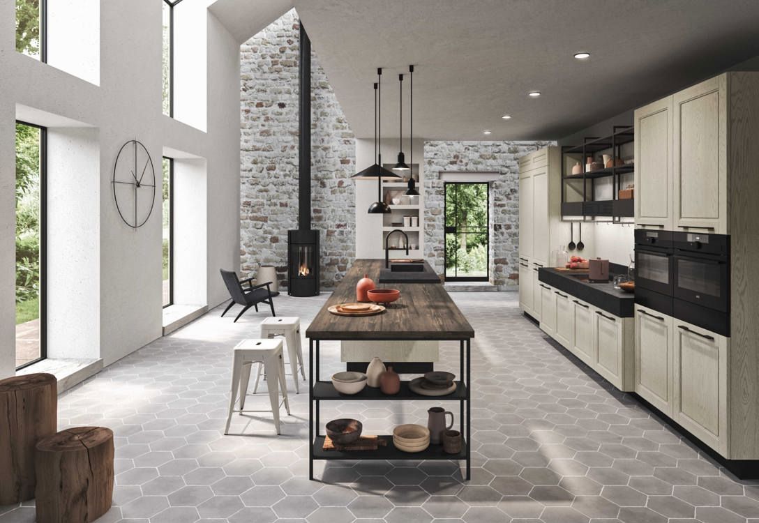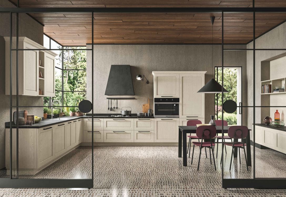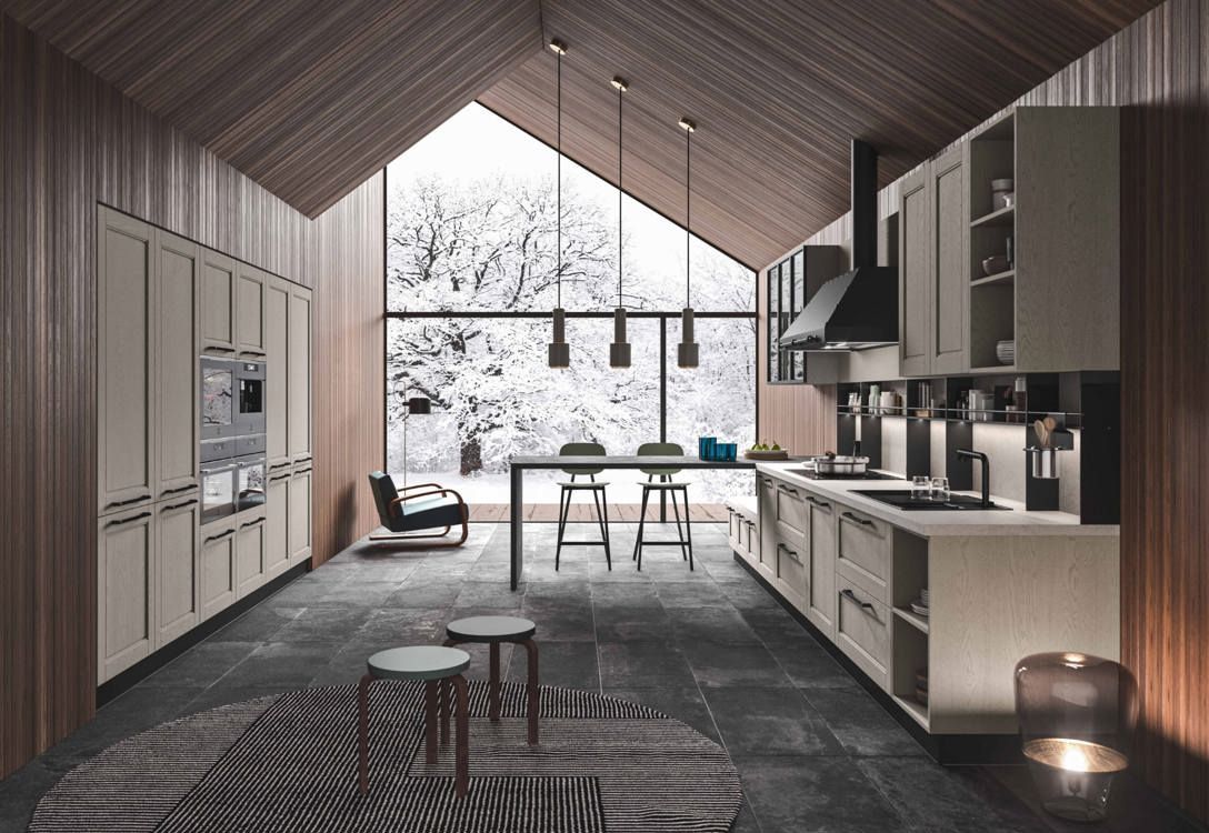 Cloe is the kitchen with framed cabinet doors combined with an external handle. This kitchen range enhances both modern and classic interiors, thanks to the wide range of lacquer colours available. Wooden frames and plinths can also be added to match the colour of the doors.