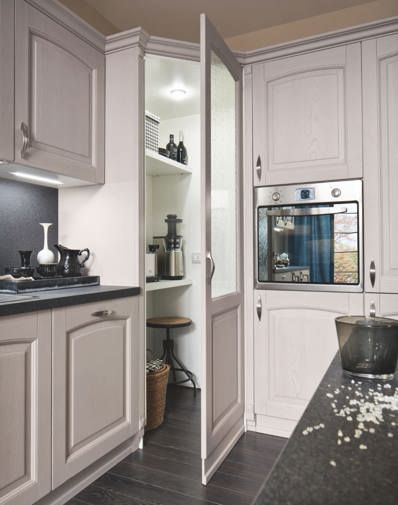 In cucina, le colonnine e ante in legno massello laccato burro opaco ben si abbinano a dettagli più contemporanei, come il top e lo schienale in laminato materico nero e gli elettrodomestici e le maniglie in acciaio satinato.