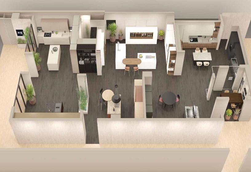 This is a functional area with carefully curated details, like the rest of the display space, because the technical stage, which includes selecting finishes and discussing the project, is part of the overall experience that a store would ideally offer.