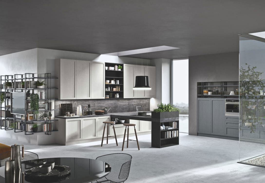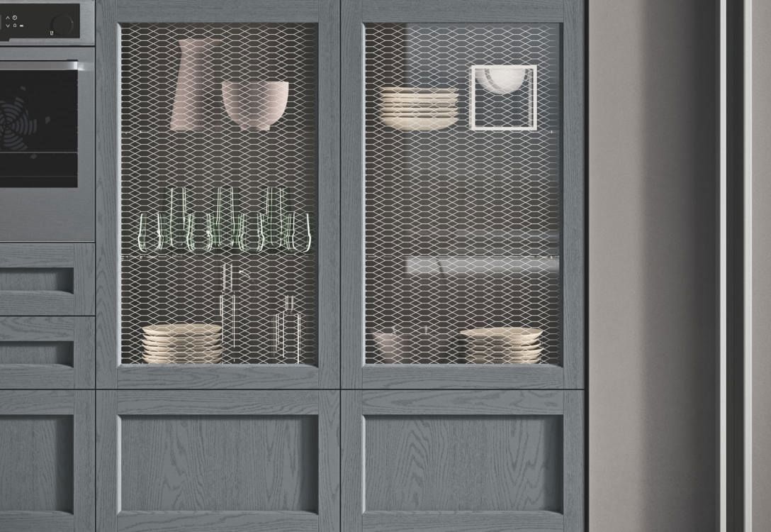 Infinity features 22-mm thick solid ash framed cabinet doors, and an ash veneered central panel. The doors can be lacquered in a choice of colours. Infinity also offers a 22-mm thick framed cabinet door in knotty natural oak, with a central panel in matching oak veneer. The door handle is on the frame itself. Solid doors can be combined with glass-framed cabinet doors in matching finishes.