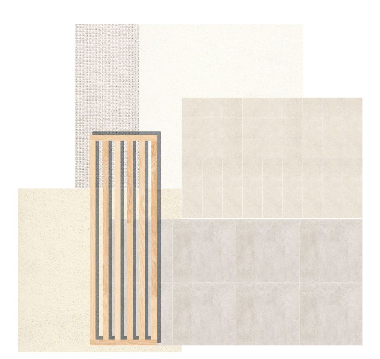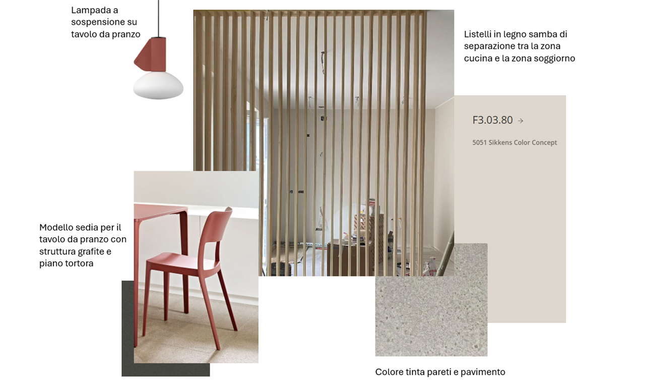 La zona giorno dell'appartamento è pensata intorno a una palette di tinte neutre e calde, con pareti e pavimento in tonalità avvolgenti e una parziale suddivisione dello spazio ottenuta attraverso listelli in legno samba — un elemento che porta texture e calore naturale all'ambiente.